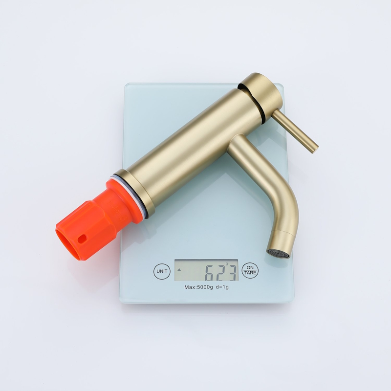Смеситель для раковины Prohanss P31.10.03, золотой сатин — это идеальное сочетание современного минималистичного дизайна и высокого качества. Изготовленный из нержавеющей стали этот кран для умывальника обеспечивает долговечность и надёжность в использовании, а также устойчивость к механическим повреждениям. Механизм смесителя для раковины основан на керамическом картридже с рычажным управлением, что гарантирует лёгкость и точность регулировки температуры и напора воды. Его минималистичный дизайн станет настоящим украшением вашей ванной комнаты, гармонично вписываясь в любой интерьер благодаря лаконичным формам и элегантным линиям.