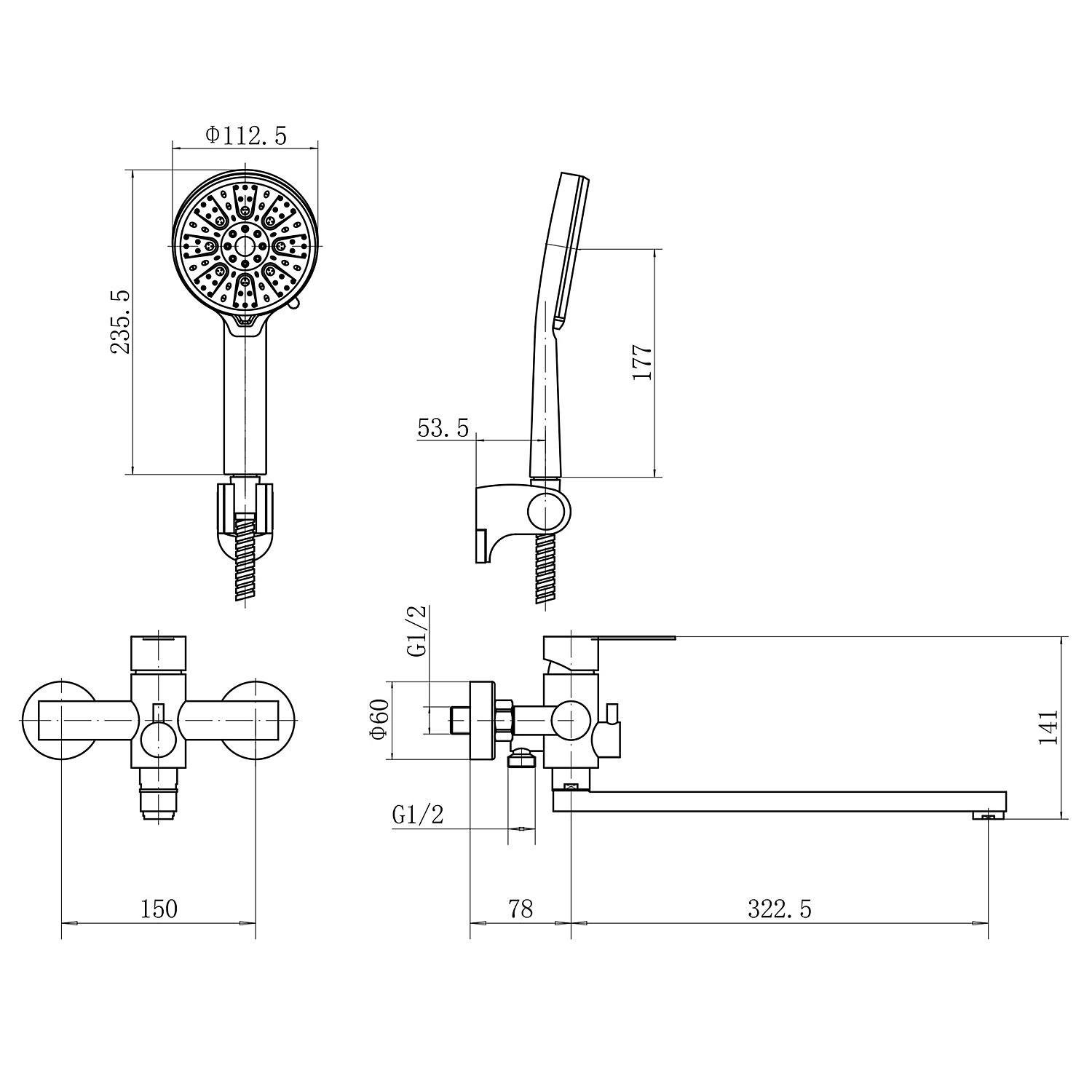 Модель комплектуется гибким шлангом длиной 150 см, что позволяет свободно пользоваться душевой лейкой по всей ванне. Смеситель монтируется на стену с помощью стандартных эксцентриков, подключение осуществляется через резьбу 1/2". Керамический картридж обеспечивает плавное управление температурой и напором воды.