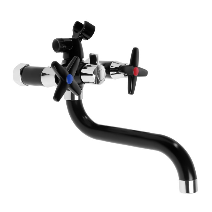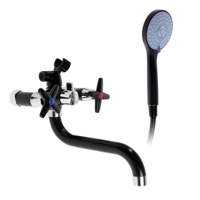 Настенный двухвентильный смеситель для ванны с душевым набором, излив 200 мм, кран-буксы 1/2, цвет черный/хром — модель для установки на стену над ванной. Два вентиля с кран-буксами регулируют напор горячей и холодной воды. В комплект входит душевая лейка, шланг и настенный держатель. Поворотный S-образный излив длиной 200 мм направляет воду в ванну. Двухцветное исполнение сочетает черный корпус и хромированные элементы.