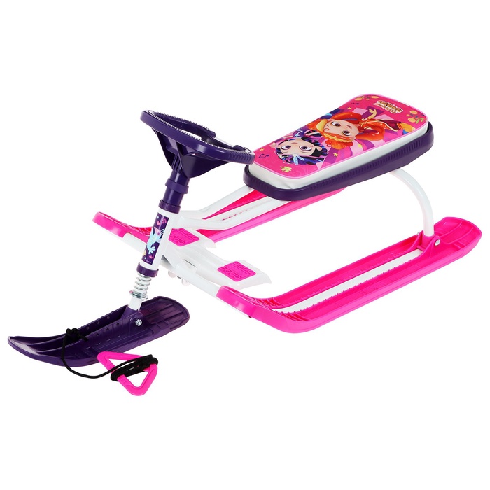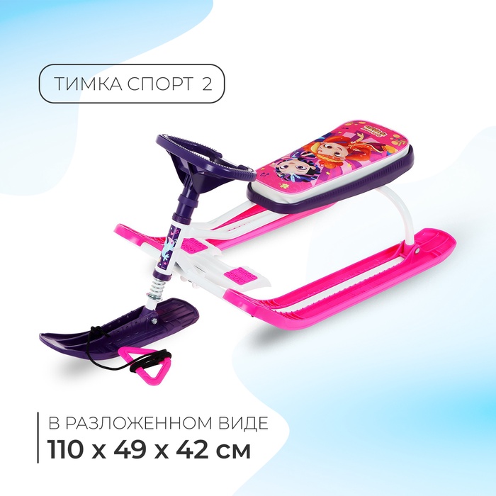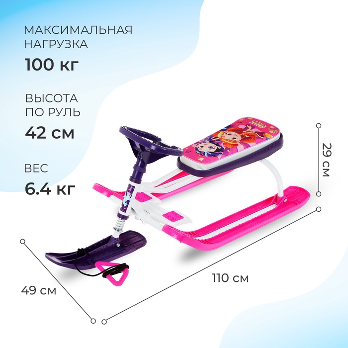 Снегокат предназначен для перевозки детей по плотному снегу или льду, катанию с горок. Имеет сварную конструкцию из стальных труб и пластиковых элементов. Оснащён мягким сиденьем, обтянутым искусственной кожей с рисунком. Оборудован буксировочным тросом и системой амортизации, которая обеспечивает комфортную поездку по крутым горкам и неровным поверхностям. Усиленный тормоз эффективен на обледенелой поверхности. В комплект входит набор наклеек на снегокат.