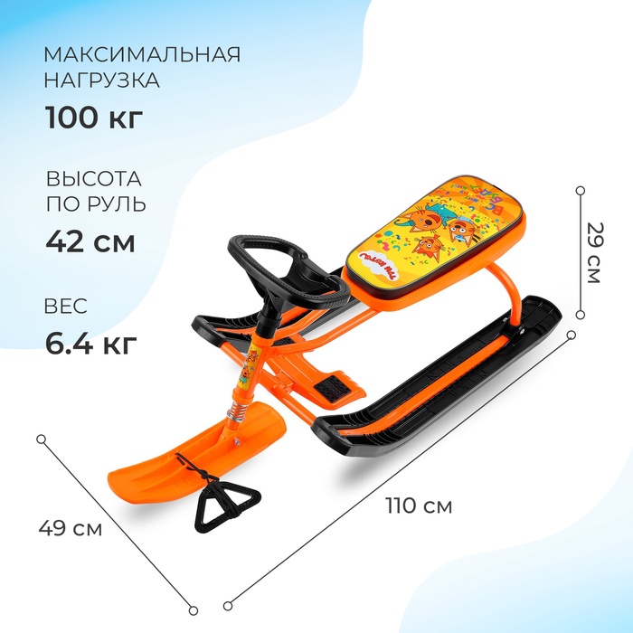 Снегокат предназначен для перевозки детей по плотному снегу или льду, катанию с горок. Имеет сварную конструкцию из стальных труб, пластиковых элементов и мягкое сиденье, обтянутое искусственной кожей с рисунком. Оснащён буксировочным тросом. Усиленный тормоз эффективен на обледенелой поверхности. В комплект входит набор наклеек на снегокат.