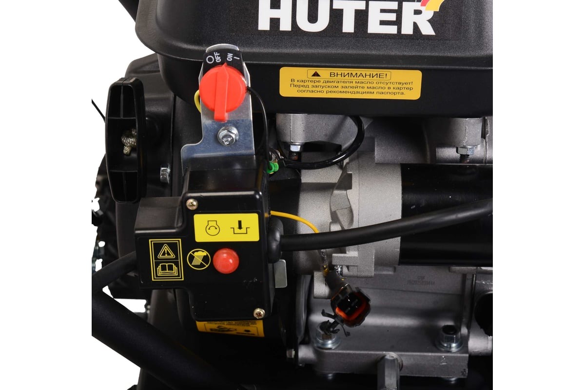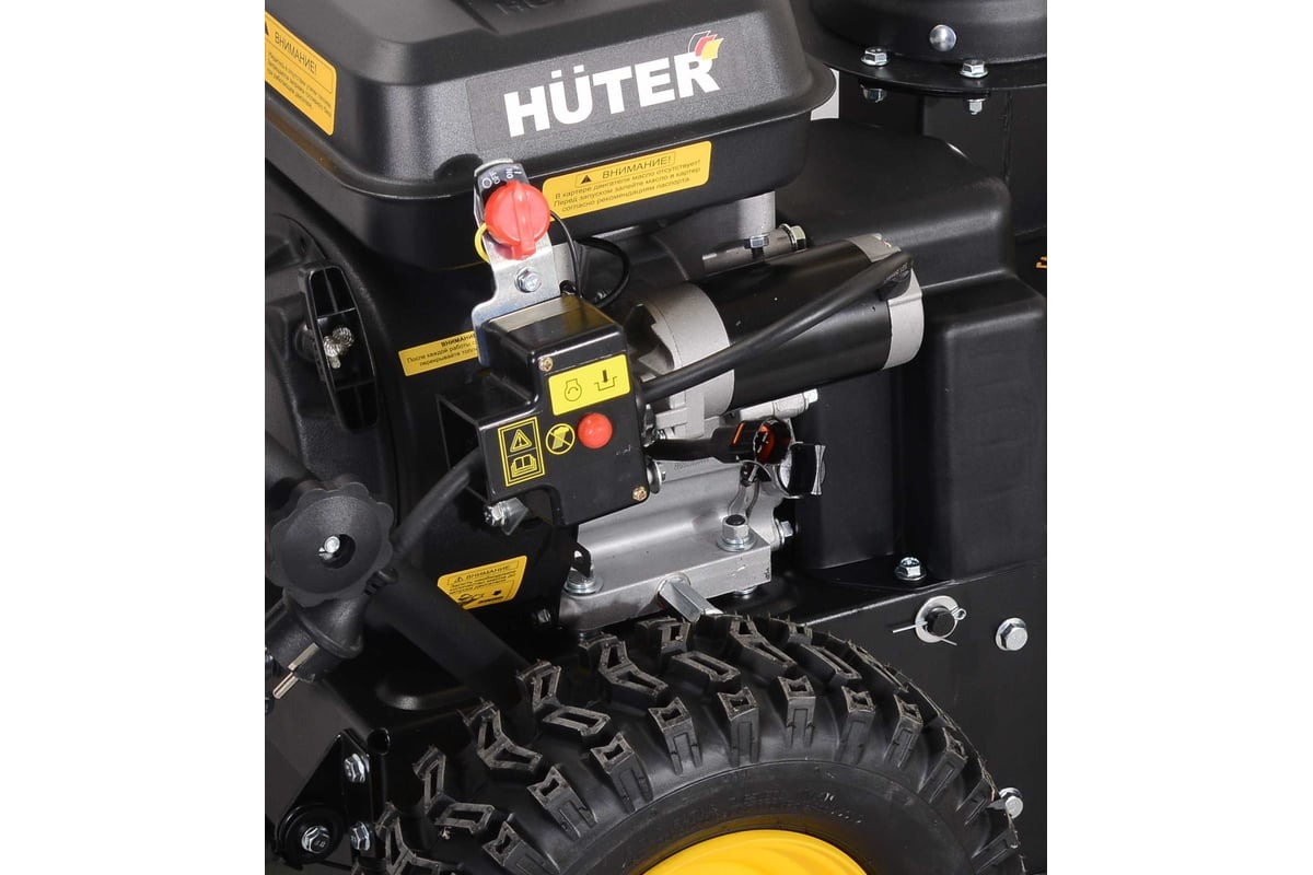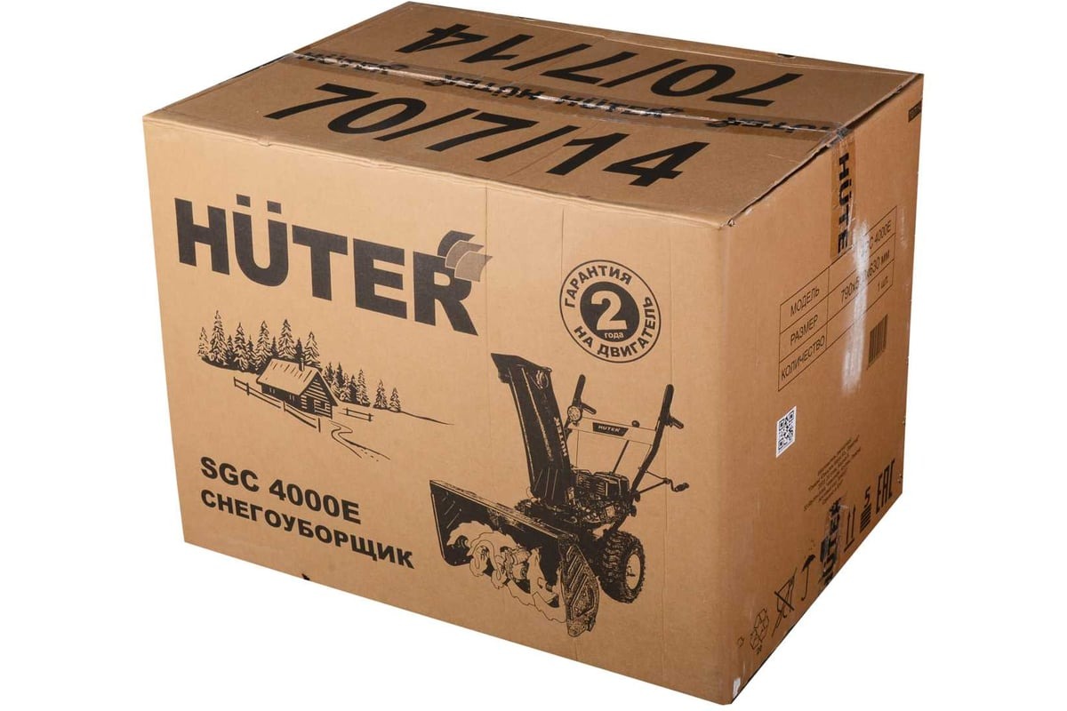 Основой устройства является четырехтактный бензиновый двигатель мощностью 7 л.с., оснащенный системой воздушного охлаждения. Специальная конструкция двигателя гарантирует надежную работу даже при значительных минусовых температурах. Машина оснащена двумя стартерами — механическим и электрическим, подключаемым к бытовой электросети напряжением 220 В, что повышает удобство и надежность запуска. Наличие электростартера отличает Huter SGC 4000E от предшественника Huter SGC 4000.