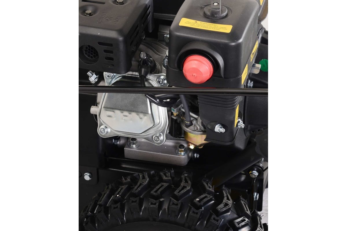 Тип снегоуборщика - самоходный. Опорные колеса оснащёны глубоким рисунком протектора, они гарантируют отличную проходимость техники по ледяной поверхности и рыхлой почве, обеспечивая устойчивость и безопасность передвижения. Рабочий шнек машины состоит из прочных стальных лопастей, способных легко справляться даже с плотным слежавшимся снегом. Устройство обладает широким шириной захвата 56 см и высотой обрабатываемого слоя снега до 42 см.