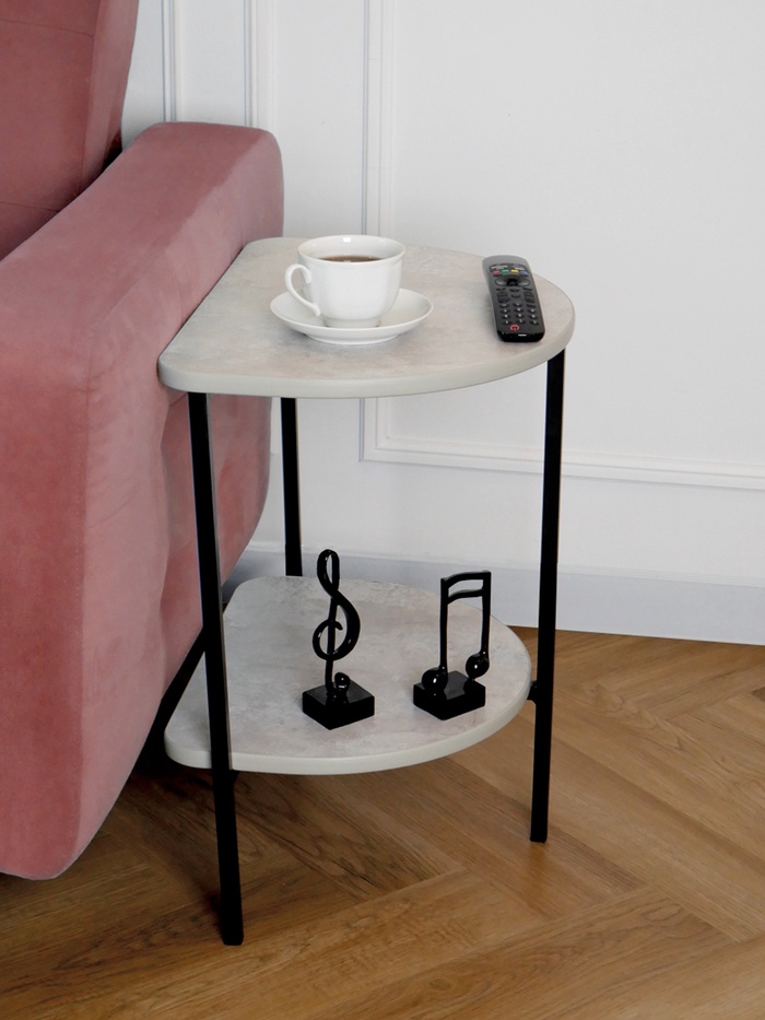 - Оригинальная форма: полукруглая форма придаёт столику изящный и нестандартный вид, позволяя использовать его как самостоятельный декоративный элемент.