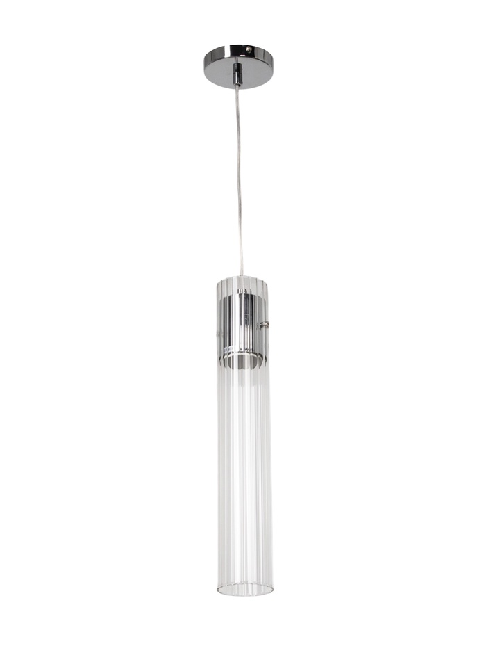 Подвесной светильник с прозрачным цилиндрическим плафоном создаёт точечное и мягкое освещение, подчёркивая современный интерьер. Хромированный металлический каркас добавляет элегантности и визуальной лёгкости, делая светильник универсальным элементом для любых помещений.