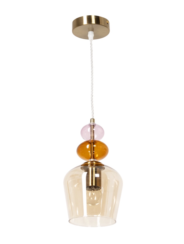 Подвесной светильник с янтарным стеклянным плафоном создаёт мягкое и тёплое освещение, наполняя пространство уютной атмосферой. Элегантное сочетание золотого основания и формы «бокал» придаёт интерьеру выразительность и современный характер.