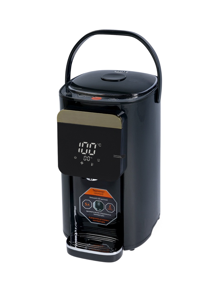 Термопот объёмом 5 л с мощностью 1 200 Вт и сенсорной панелью управления предлагает простой и комфортный доступ к горячей воде — в любое время и без лишних усилий. Чёрный корпус подчёркивает современный дизайн, а электронный дисплей позволяет задавать и отслеживать температуру.