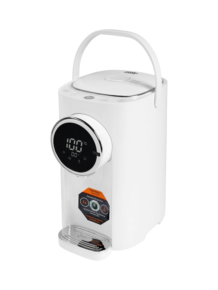 Термопот с объёмом 5 л и мощностью 1 200 Вт — это рациональное решение для дома, где горячая вода должна быть всегда под рукой. Сенсорная панель управления и LED-дисплей превращают ежедневное приготовление напитков в удобный и точный процесс: выбирайте нужную температуру и наслаждайтесь напитком без лишних хлопот.