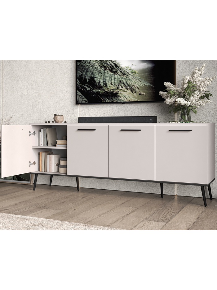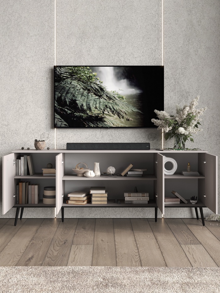 Объединяет практичность, современный дизайн и продуманную конструкцию. Обеспечивает удобное хранение техники, аксессуаров и декоративных предметов, при этом гармонично вписывается в интерьер гостиной, спальни или рабочей зоны. Качественные материалы и фурнитура гарантируют долговечность и лёгкость ухода.