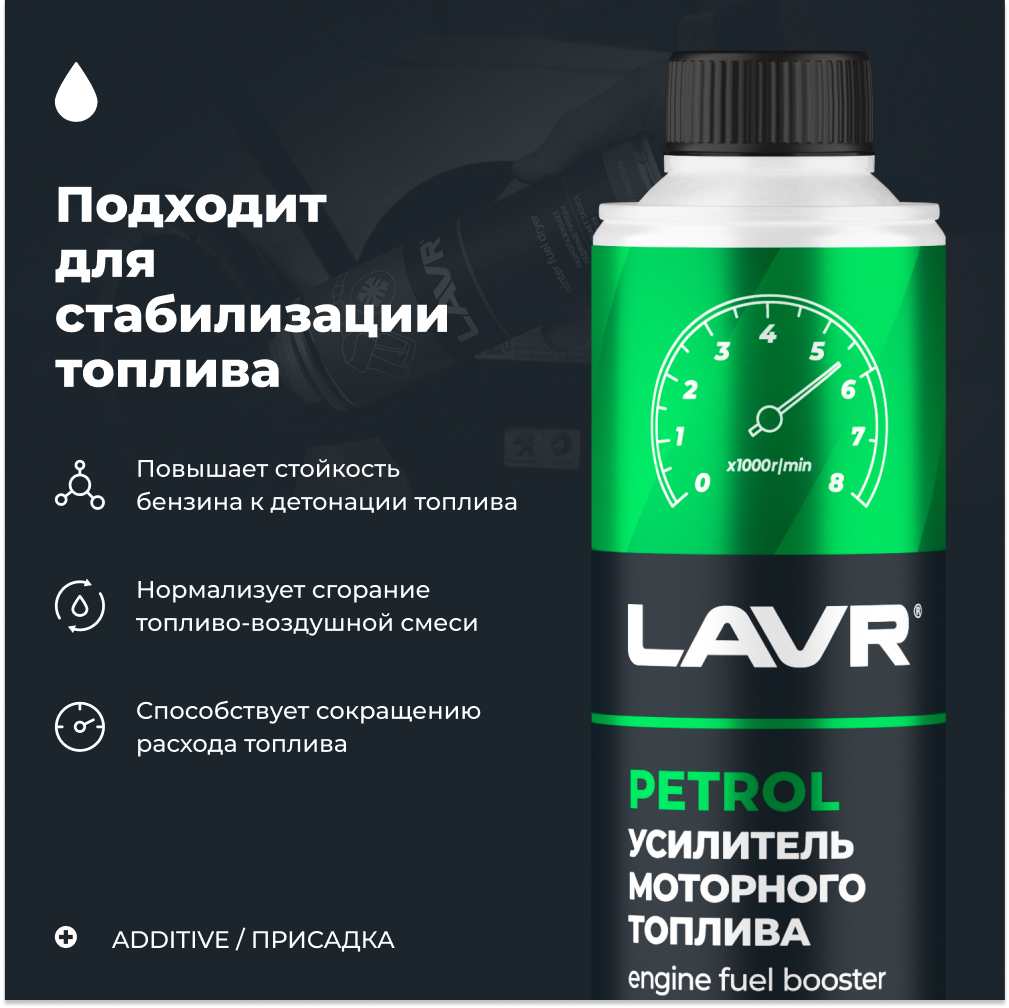 Усилитель моторного топлива в бензин на 40-60 л LAVR, 310 мл / Ln2127-L. Усилитель топлива - специальная присадка в высокооктановый бензин, которая обеспечивает максимальную мощность двигателя без вмешательства в его конструкцию. Повышает октановое число на 1-3 единицы, в зависимости от качества товарного топлива (95 - до 98, 98 - до 100). Улучшает процесс горения, повышает эффективность и отдачу двигателя, усиливает процесс самоочищения камер сгорания и очищает катализаторы. Может использоваться для стабилизации топлива сомнительного качества. Регулярное применение продукта позволяет безопасно эксплуатировать автомобиль в режиме предельных нагрузок. Подходит для всех типов бензиновых двигателей. Повышает октановое число вплоть до 100 единиц. Улучшает сгорание топливовоздушной смеси. Предотвращает детонацию и калильное зажигание. Способствует сокращению расхода топлива. Для повышения мощности и отдачи двигателя одна упаковка применяется на 30-40 литров бензина. Для стабилизации топлива одна упаковка применяется на 80-120 литров бензина. Не рекомендуется для систематического применения. Перед применением прогреть до комнатной температуры. Рассчитать дозировку в соответствии с задачей по коррекции топлива. Залить в топливный бак непосредственно перед заправкой. Израсходовать бензин без дозаправки.