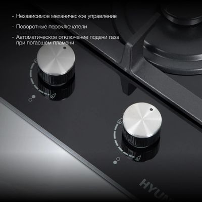 Hyundai HHG 3235 BG оснащена поворотными ручками с плавной настройкой пламени. Благодаря встроенному электроподжигу не нужно использовать спички для высекания искры в конфорках. В целях безопасности установлена система газ-контроля для своевременного отключения подачи газа при затухании огня.