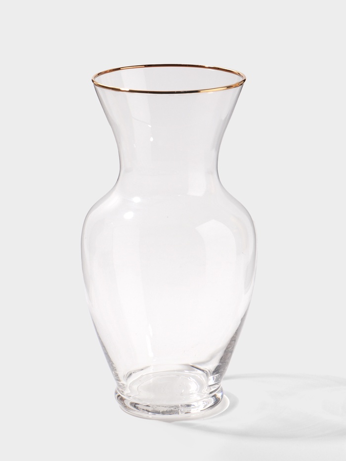 Элегантность в чистом виде. Ваза «Миа» из прозрачного стекла с золотым отливом — это настольная ваза, где главную роль играет материал. Стекло и тонкое золотое напыление создают эффект лёгкого сияния, превращая обычный букет в изысканную композицию.