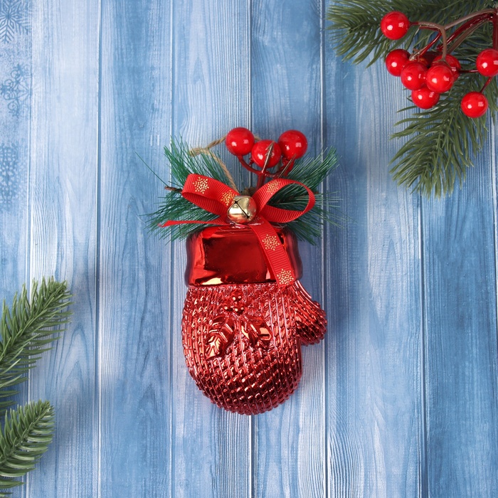 Новогоднее украшение в форме варежки с ягодными акцентами выполнено в стиле барокко, подчёркивая праздничную атмосферу. Ярко-красный цвет и объёмное наполнение придают декору выразительность и тепло, гармонично дополняя ёлочные композиции.